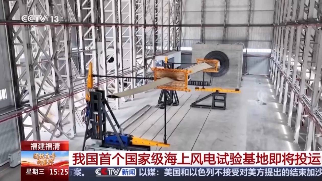 r总台记者黄珊:海上风电试验基地包括陆上检测中心和试验风电场两部分,陆上检测中心坐落于福清市的江阴产业园内,靠近江阴港码头,旁边是福建最大的风电产业园。整个陆上检测中心包含了叶片试验平台和传动链测试平台。