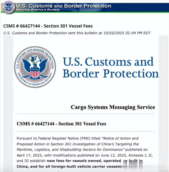 美东时间 10 月 3 日,美国海关和边境保护局(CBP)在官网正式发布公告,《第 301 条款船舶费用》公告,宣布对中国拥有、运营或建造的船舶征收新费用,以及对所有外国建造的汽车运输船设立了新的费用。